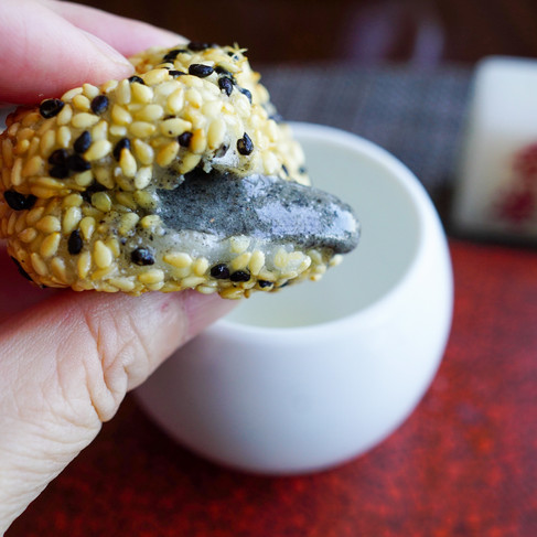 アツアツの胡麻団子の中からは黒胡麻のお汁粉のような餡がとろ〜り